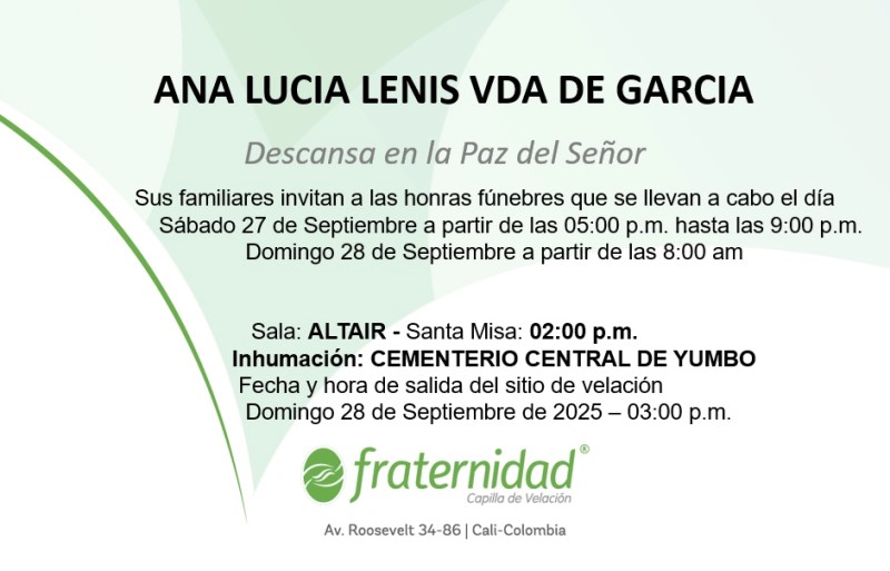 En los momentos en que los yumbeños recorrían las calles de Yumbo con la imagen del Cristo Peregrino, acto de piedad popular que antecede a la celebración de la fiesta patronal del Señor del Buen Consuelo, en la ciudad de Cali fallecía la matrona yumbeña Ana Lucía Lenis Díaz vda. de García cuando era intervenida quirúrgicamente.