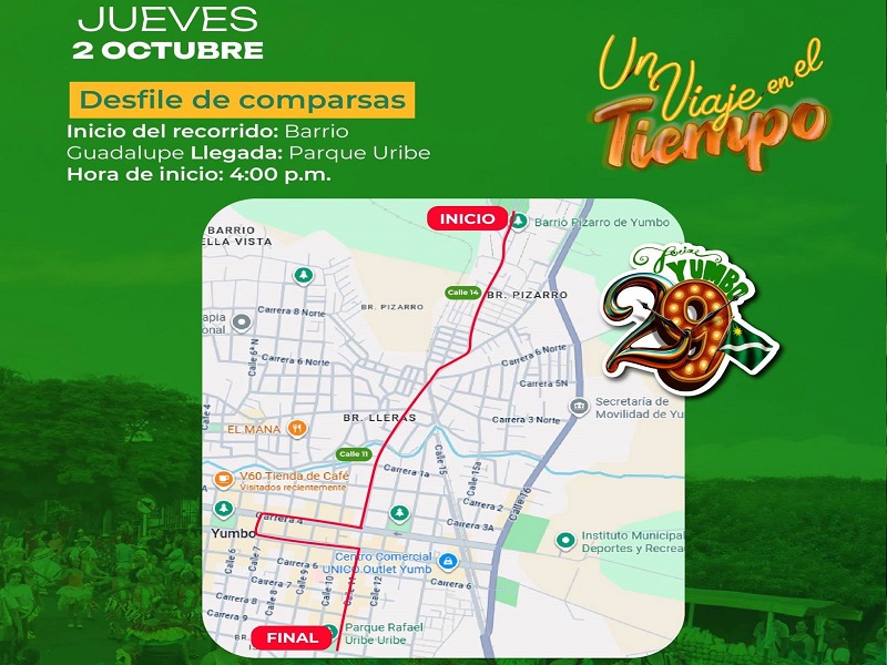 El Desfile, que será transmitido por el Canal Telepacífico y las redes sociales de la Alcaldía de Yumbo, terminará en el parque Alfonso López Pumarejo (barrio Uirbe Uribe) donde, según anuncia el programa oficial habrá espectáculo musical con una banda y un mariachi.