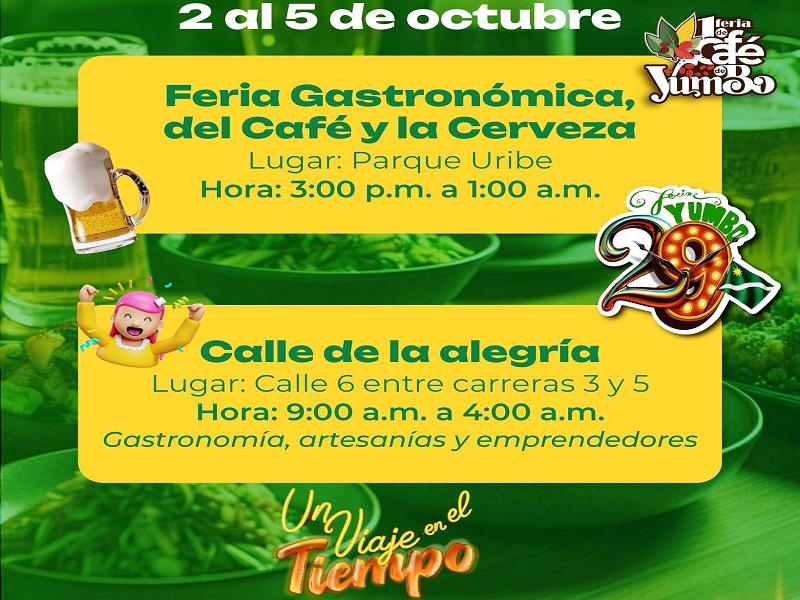 Y el parque Alfonso López Pumarejo del barrio Uribe Uribe (manzana de la Carreras 9ª y 10 y Calles 10 y 11) funcionará la Feria Gastronómica, del Café y de la Cerveza. En este espacio los locales y turistas podrán degustar los sabores locales y conocer las propuestas innovadoras de emprendimientos y artistas yumbeños.