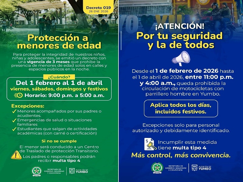 En cuanto al Decreto 022 del 30 de enero de 2026, la Administración Municipal adoptó de manera transitoria la prohibición de la circulación de motocicletas con acompañante del sexo masculino en todo el territorio de Yumbo, medida que regirá entre el 1 de febrero y el 1 de abril de 2026, en el horario de 11:00 p.m. a 4:00 a.m., todos los días de la semana, incluidos domingos y festivos. Esta decisión se aplicará en franjas horarias nocturnas estratégicas, con el propósito de no afectar la actividad comercial ni las dinámicas cotidianas de las familias, y responde a un enfoque preventivo que prioriza la seguridad.
