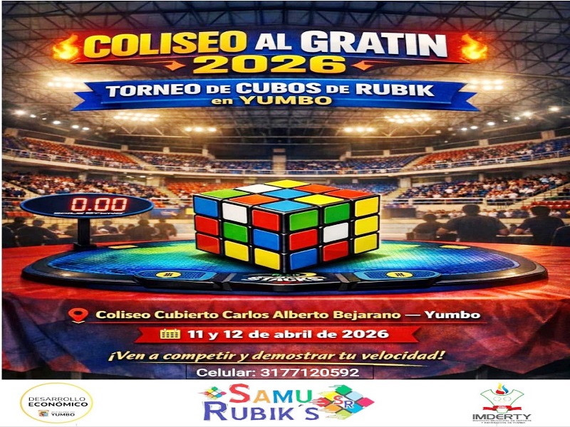 Por primera vez en Yumbo, y gratis, este fin de semana sábado 11 y domingo 12 de abril, se llevará a cabo el Torneo de Cubo Rubik en el Coliseo “Carlos Alberto Bejarano” de la Carrera 6ª con Calle 6ª, barrio Belalcázar, en competencias de 7:00 a.m. a 6:30 p.m.